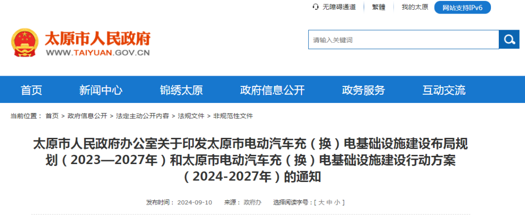 充换电头条获悉,9月10日,太原市人民政府办公室发布关于印发太原市电动汽车充(换)电基础设施建设布局规划(2023—2027年)和太原市电动汽车充(换)电基础设施建设行动方案(2024-2027年)的通知。