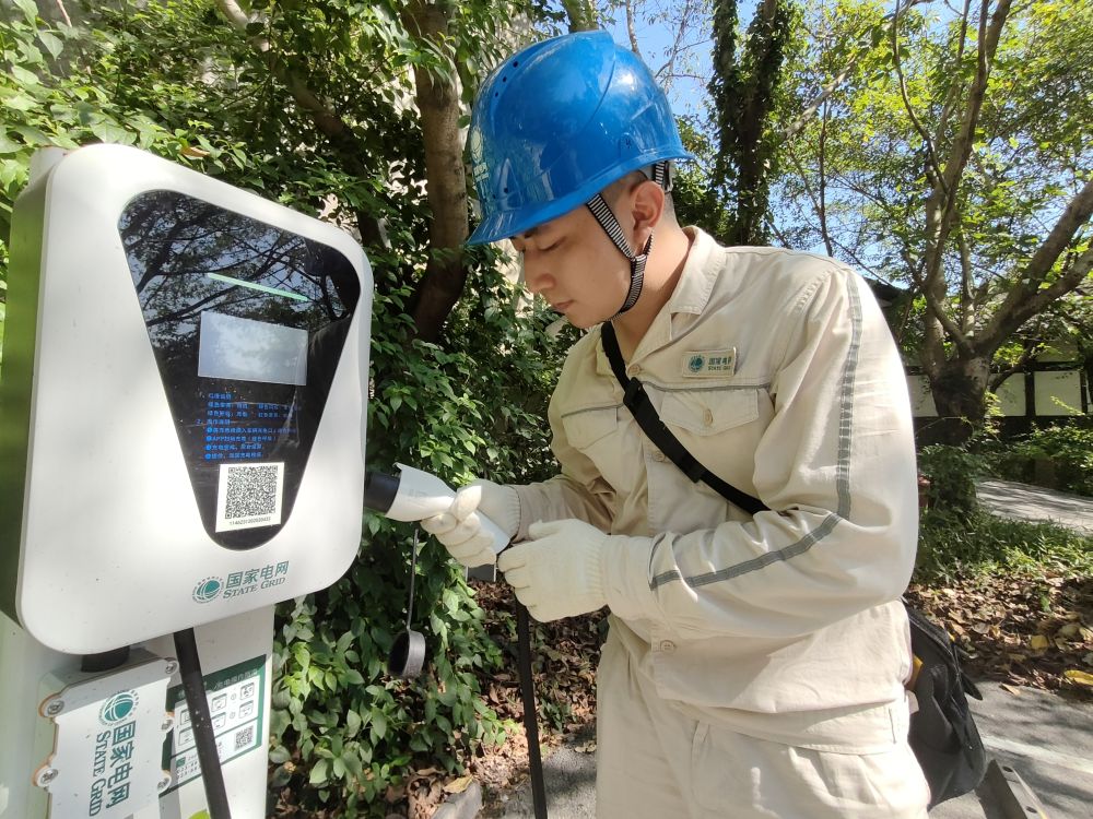 图为工作人员正在检查充电桩情况。